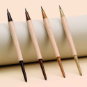 Bürsten Sie die Brauen nach oben und füllen Sie die fehlenden Strähnen mit dem cremigen Stift mit kurzen Strichen nach oben in Richtung der Haare auf. Mit dieser Seite des Stifts füllen Sie die Augenbrauen auf und definieren deren Form. Ziehen Sie dann mit der anderen Seite des Stifts feine Linien, um den Eindruck echter Härchen zu erwecken. Mit dem dünnen flüssigen Filzstift intensivieren Sie das Ergebnis und schaffen dünne haarähnliche Linien.