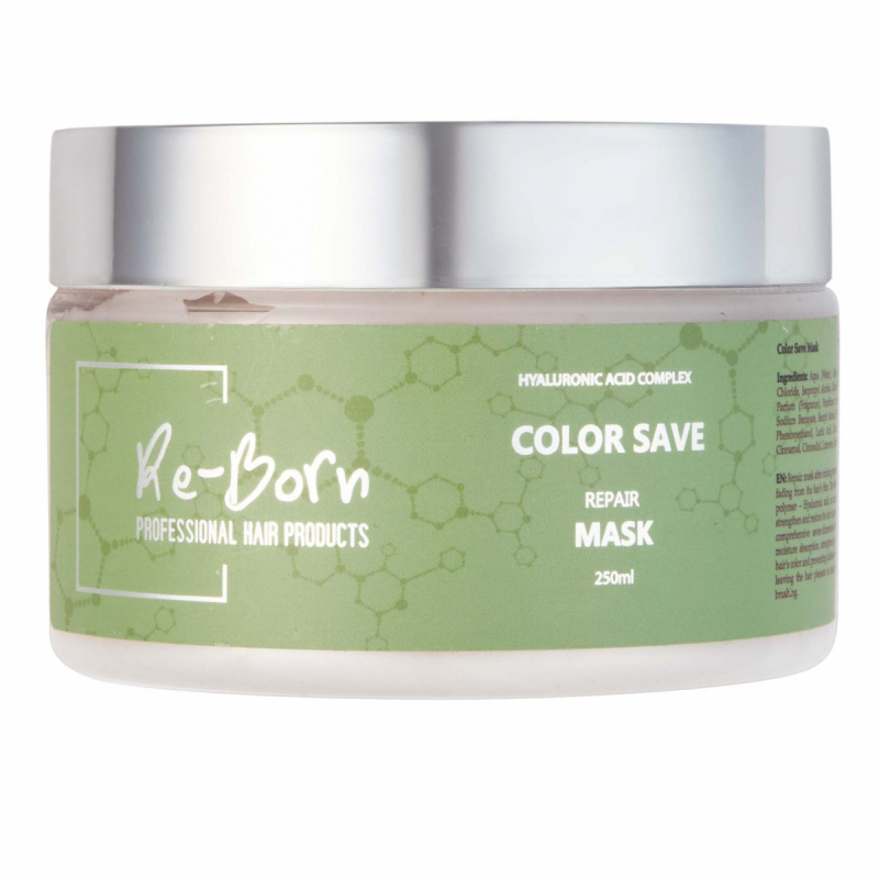 Re-Born Color Saving Mask to naprawcza maska do włosów dla osób z farbowanymi włosami. Maska do włosów ma innowacyjną formułę i jako pierwsza na świecie zawiera silny polimer - kwas hialuronowy. Ta potężna maska do włosów pokrywa trzon włosa kuracją siedem w jednym, która głęboko nawilża i chroni włosy przed zimnem. Jednocześnie wzmacnia włókna włosów, ich elastyczność, zachowuje kolor, zapobiega matowieniu i neutralizuje wolne rodniki. Wszystko po to, aby włosy były miękkie i gładkie nawet po szczotkowaniu. Stosować w połączeniu z szamponem Re-Born Color Save Shampoo i odżywką Re-Born Color Save Conditioner.